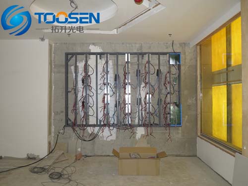 LED電子屏的鋼架和電源線基本都已經(jīng)接好,準備拼接LED模組。